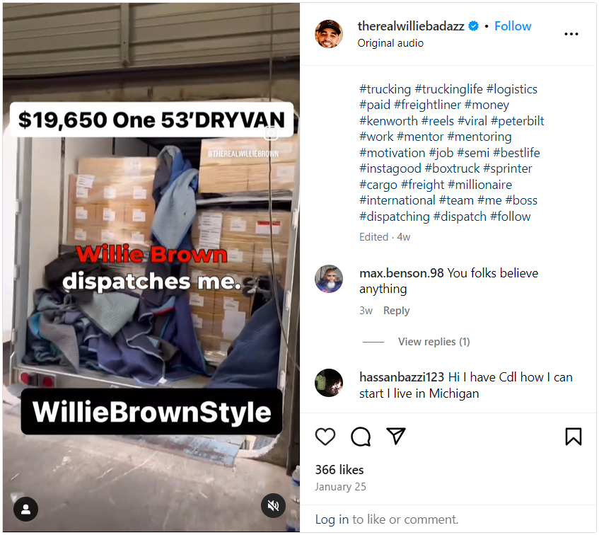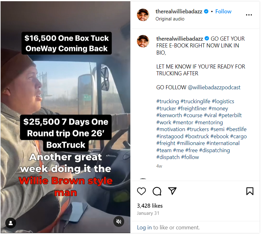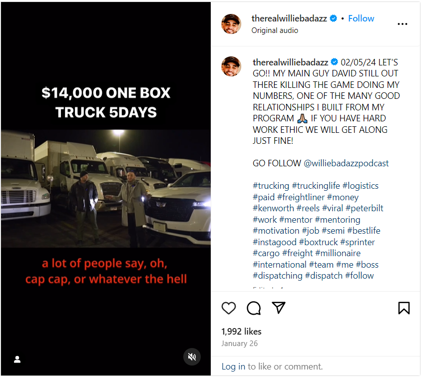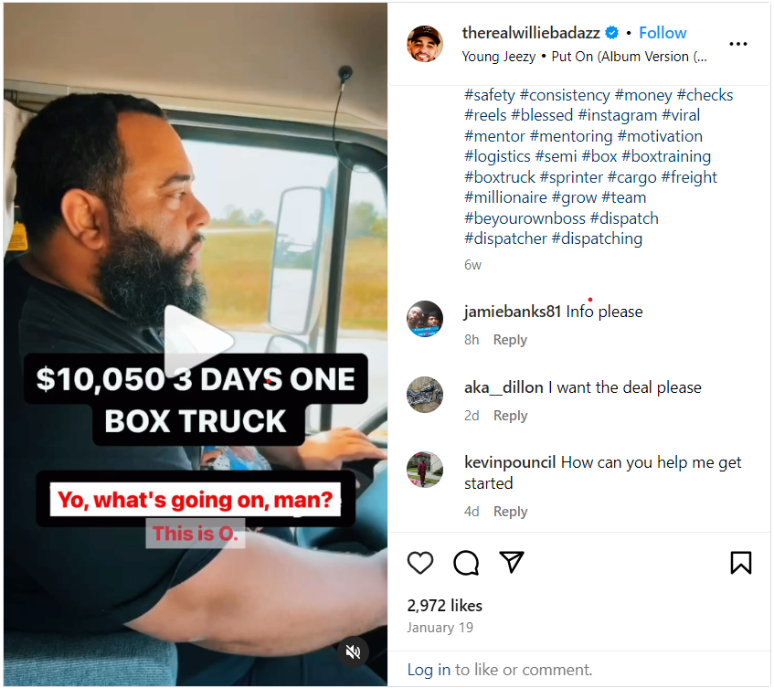 Willie Brown will personally teach you his successful tech-niques. As of 2024, our box trucks are earning an average of 15-20k a week, while our 53s are averaging 20-30k a week.